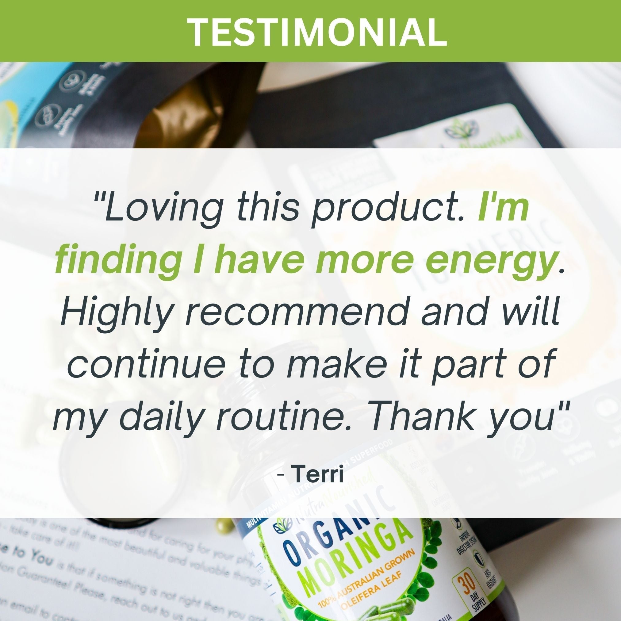 Nutra Nourished Organic Moringa Leaf Capsules are made with naturally dried Australian grown Moringa Leaf. Each capsule contains 360mg of Moringa Leaf powder with 60 capsules per bottle.