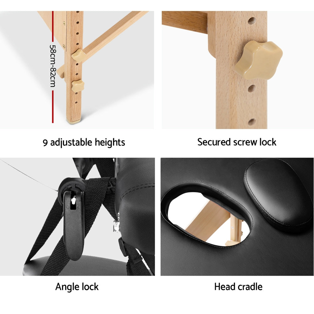 Zenses Massage Table 75cm Portable 3 Fold Wooden Beauty Bed Black